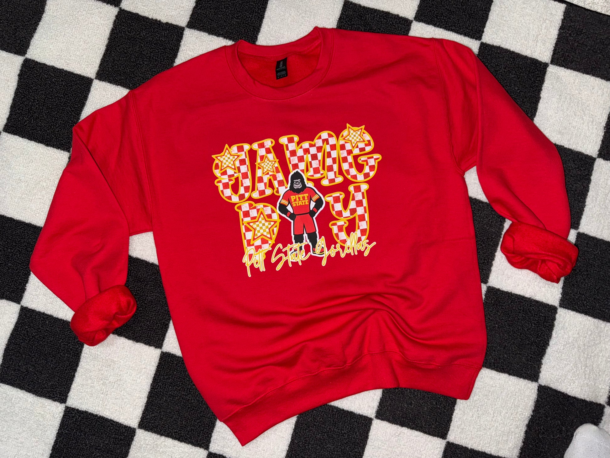DTF printed on a red crew